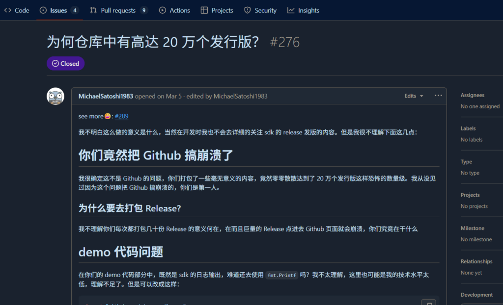 )因为版本管理问题引发了开发者的集中吐槽。这个仓库的发行版(Release/Tag)数量一度高达20万个,导致GitHub页面崩溃、开发者无法正常使用,甚至被批评为“软件工程管理的错误示范”。